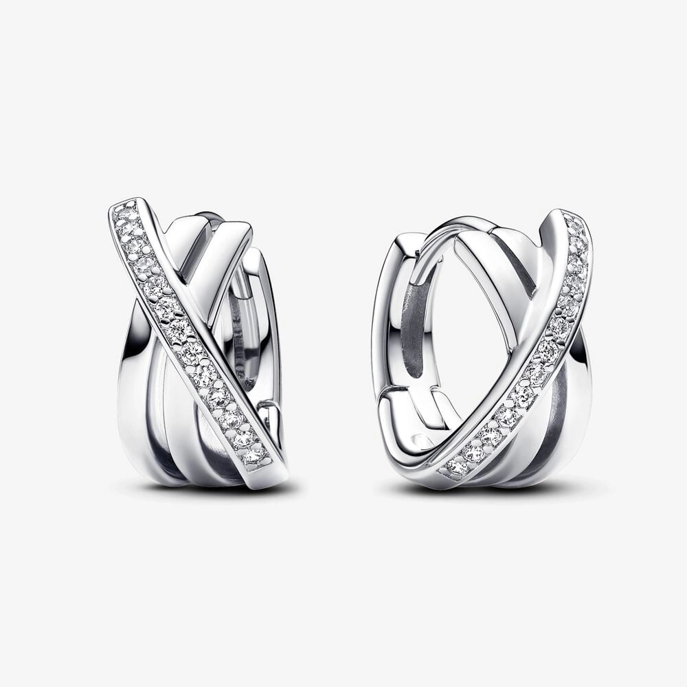 Embrace modern elegance with our Crossover Pavé Hoop Earrings. Crafted in sterling silver, these hoops feature a chic X-shaped profile created by squared crossover bands. With multiple clear cubic zirconia stones set in a pavé style, the delicate design adds a touch of glamour to any occasion. The delicate details, like the grooved lines and engraved Pandora logo on the click closure, make these earrings a perfect blend of style and sophistication. Sold as a pair and featuring mirrored designs on the right and left piece.
