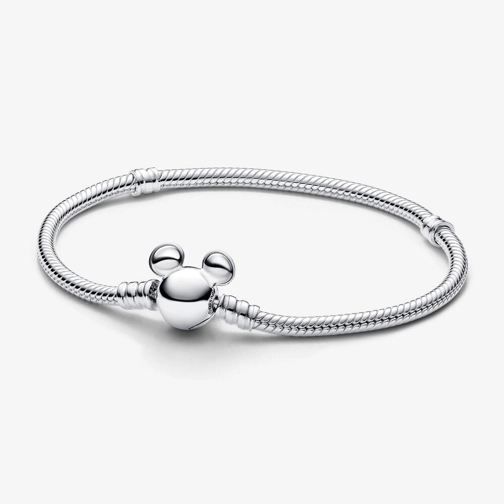 Style your Disney x Pandora charm collection on the Disney Mickey Mouse Clasp Moments Snake Chain Bracelet. This sterling silver snake chain bracelet features a clasp inspired by the iconic Mickey Mouse head silhouette. Press Mickey's ears in opposite directions to easily open and close the clasp. The bracelet has two threaders (raised charm dividers) and can hold 16-18 charms or dangle charms. The perfect way to showcase your Disney favourites.