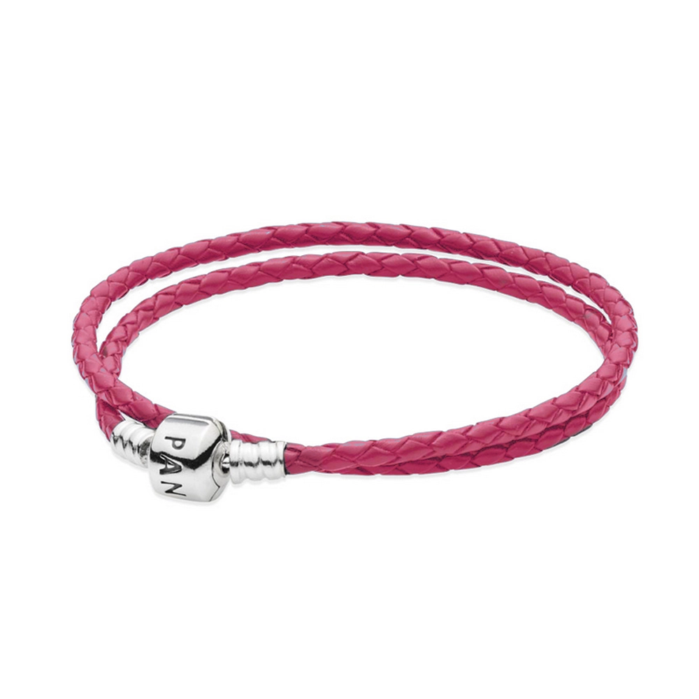 This double pink woven leather bracelet features the Pandora silver snap clasp.
