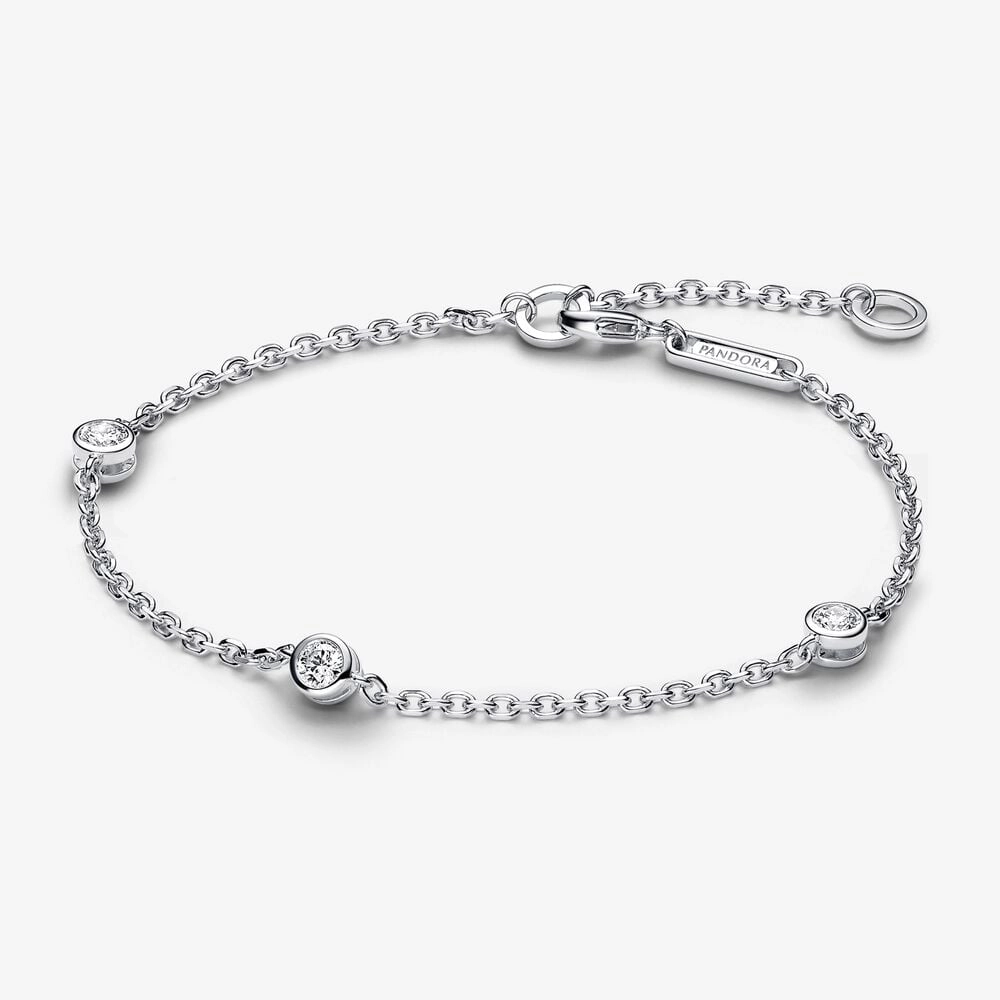 Meet your new essential lab-grown diamond bracelet. The Pandora Era Bezel Sterling Silver Lab-grown Diamond Station Chain Bracelet features three bezel-set 0.10 carat lab-grown diamonds, with a total carat weight of 0.30. Cut-outs on the back and sides of the bezel setting let in the light for ultimate sparkle. The lab-grown diamonds are fixed along a sterling silver diamond-cut cable chain with faceted links that reflect the light, lending the bracelet a subtle shimmer. Adjustable to two lengths, it's the perfect elevated staple for your everyday looks.