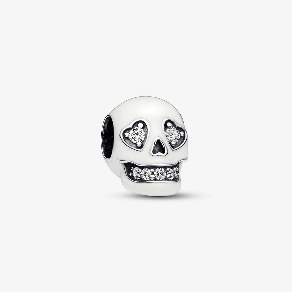 Add some edge to your look when you wear the Glow-in-the-dark Sparkling Skull Charm. This sterling silver charm features a skull covered in glow-in-the-dark enamel with a mouth and heart-shaped eyes sparkling with clear cubic zirconia stones. Cut-out details adorn the sides of the mouth, the nose and the bottom of the skull. Pay homage to the mystery of the afterlife and add an irreverent – not to mention glowing – touch to your style with this skull pendant.