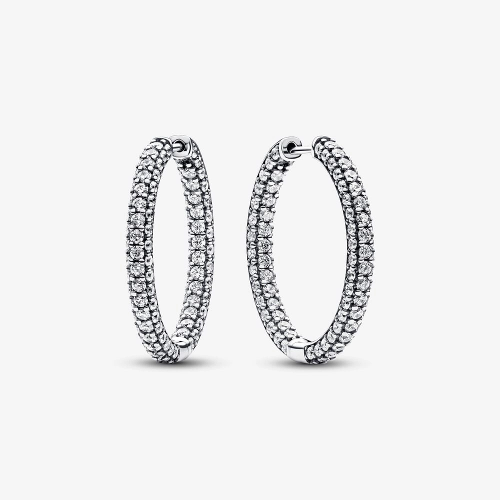 Classic hoops get a sparkling update in the Pandora Timeless Pavé Single-row Hoop Earrings. These sterling silver hoop earrings feature a D-shaped profile covered in pavé. Set with 198 round bead-set stones, these hoops will make any look shine. Peek inside to see the iconic Pandora logo engraved on the hoops' interior. Elevate your day-to-day style with these statement hoops or pair them with other sparkling pieces for a high-impact evening look.
