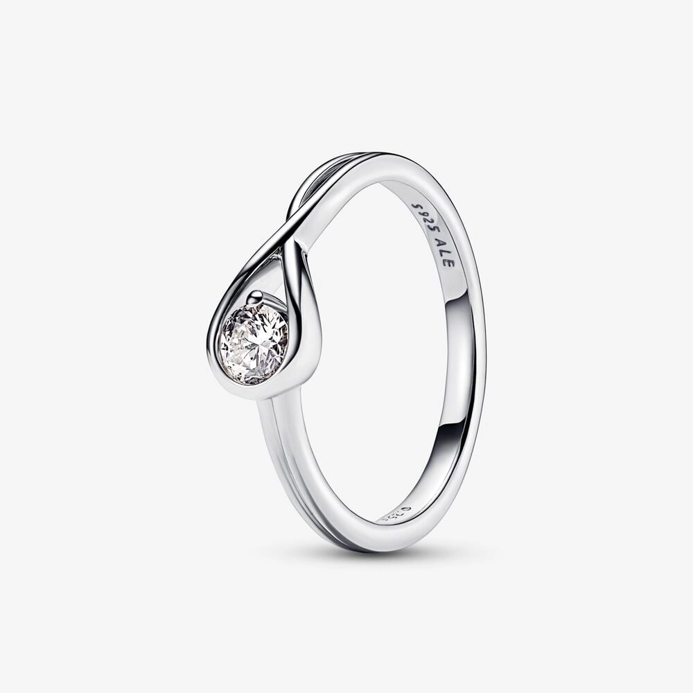 A solid sterling silver ring hand set with a 0.25 carat lab-grown diamond. A beautiful statement of empowerment and possibility, or a simple yet eloquent declaration of love. This ring features a scintillating round brilliant excellent cut lab-grown diamond in a modern infinity setting that flows seamlessly around the stone. It can be worn alone or stacked with other rings from the Pandora Infinite collection. Each Pandora Lab-grown diamond is treated with a post-growth colour enhancement called annealing.