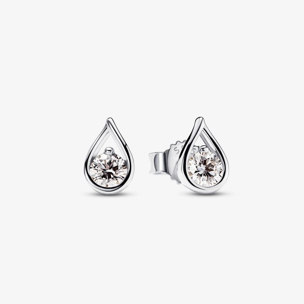 A pair of solid sterling silver stud earrings each hand set with a 0.10 carat lab-grown diamond. A sparkling celebration of the infinite potential within all of us, these earrings feature a radiant round brilliant excellent cut lab-grown diamond suspended in our modern infinity setting. Each Pandora Lab-grown diamond is treated with a post-growth colour enhancement called annealing.