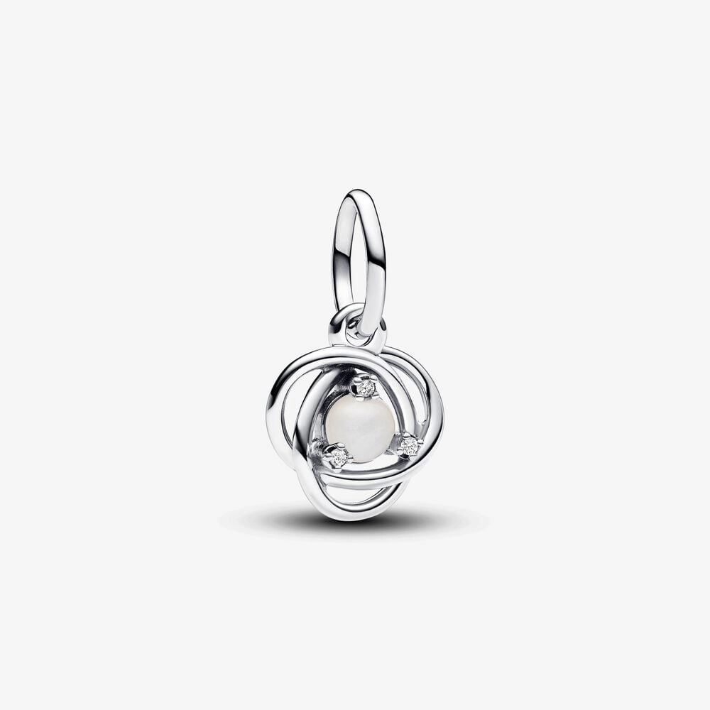 This intricate White Eternity Circle Dangle Charm is a must-have for your Pandora Moments collection. Crafted in lustrous sterling silver, it features an openwork infinity braid decorated with a central white bioresin man-made mother of pearl cabochon, elegantly enhanced with three clear cubic zirconia. The intricate design symbolizes eternity and adds an additional layer of meaning to the piece. Elevate your bracelet with this timeless piece or gift it as a symbol of an everlasting bond.