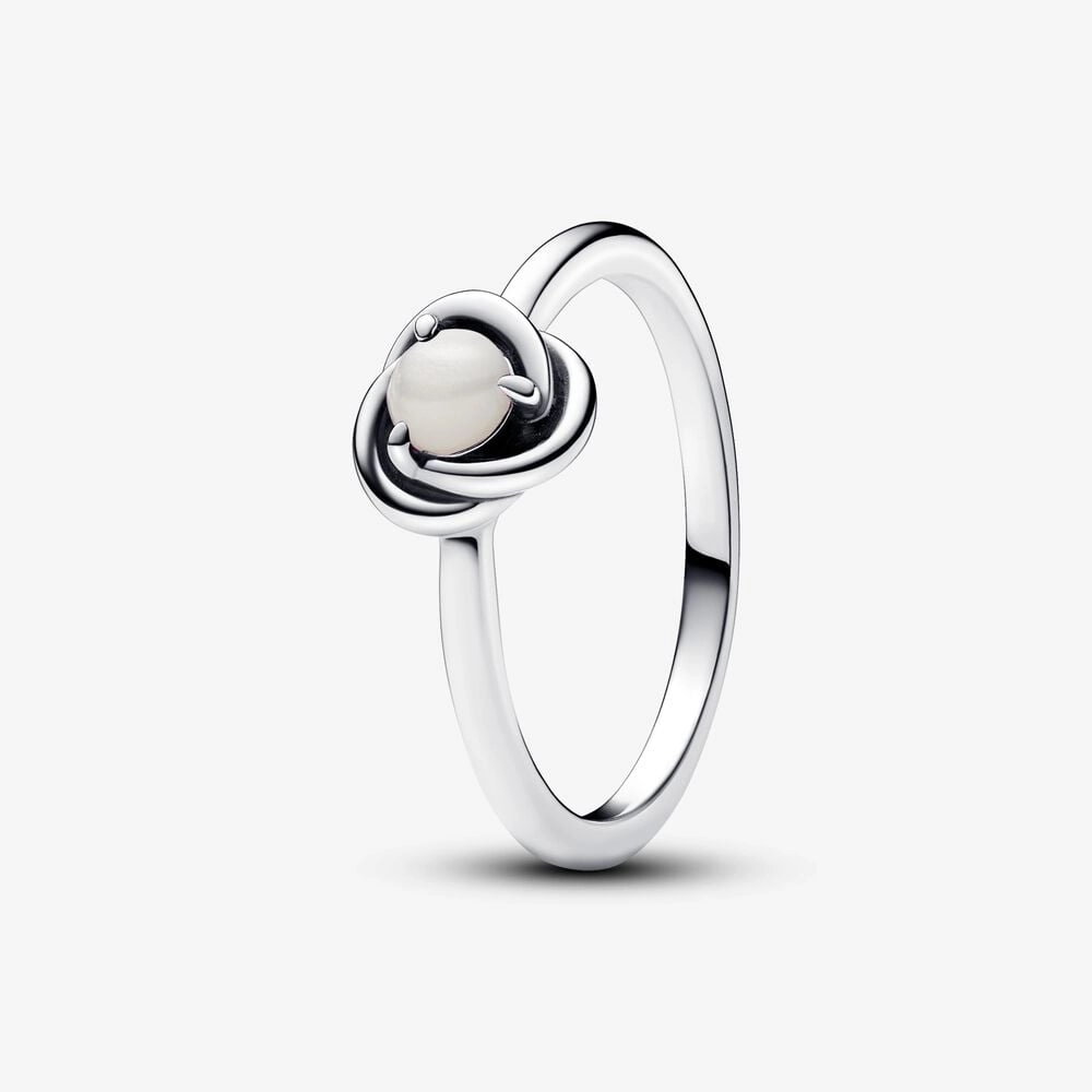 Wear a symbol of forever with the White Eternity Circle Ring. This sterling silver ring features a smooth cabochon-cut bioresin man-made mother of pearl stone. The polished band wraps around the centre stone in an openwork braided infinity pattern. Whether you want to carry a reminder of eternal love or a symbol of the timeless joy that infuses each and every moment, this colourful eternity ring will bring sparkling meaning to your look.