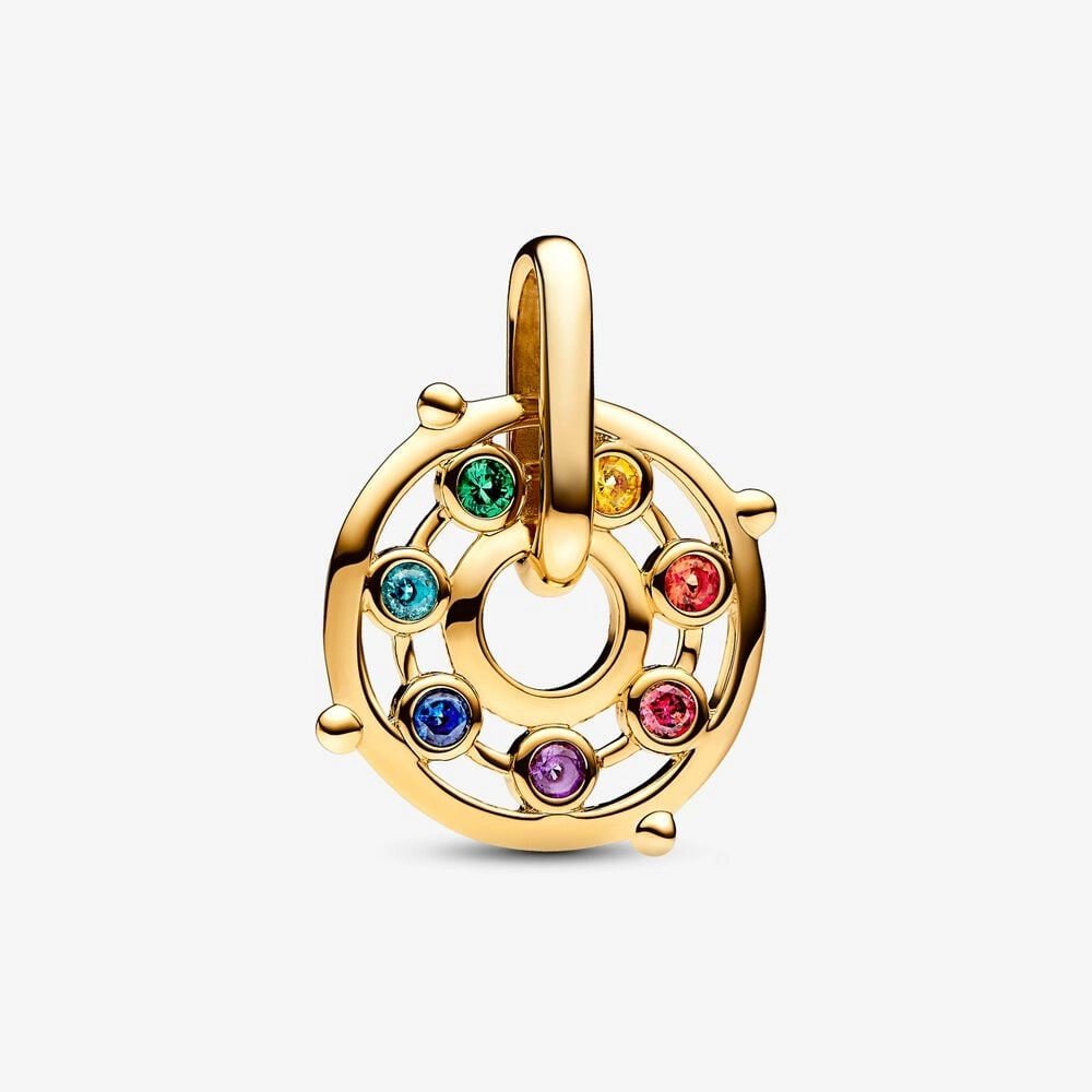 Bring vibrancy to your looks with the Pandora ME Chakra Medallion Charm. The 14k gold-plated design features a wheel (that really spins!) with seven bright stones, dedicated to each of the energy centers in your body. The rainbow of man-made crystals and cubic zirconia are bezel-set and perfectly aligned, of course. This meaningful medallion charm also features a new closed top that matches the shape of our Pandora ME links - giving your styling a seamless look. Representing balance and physical, emotional and mental wellbeing, wear this piece as a reminder to connect with yourself every day.