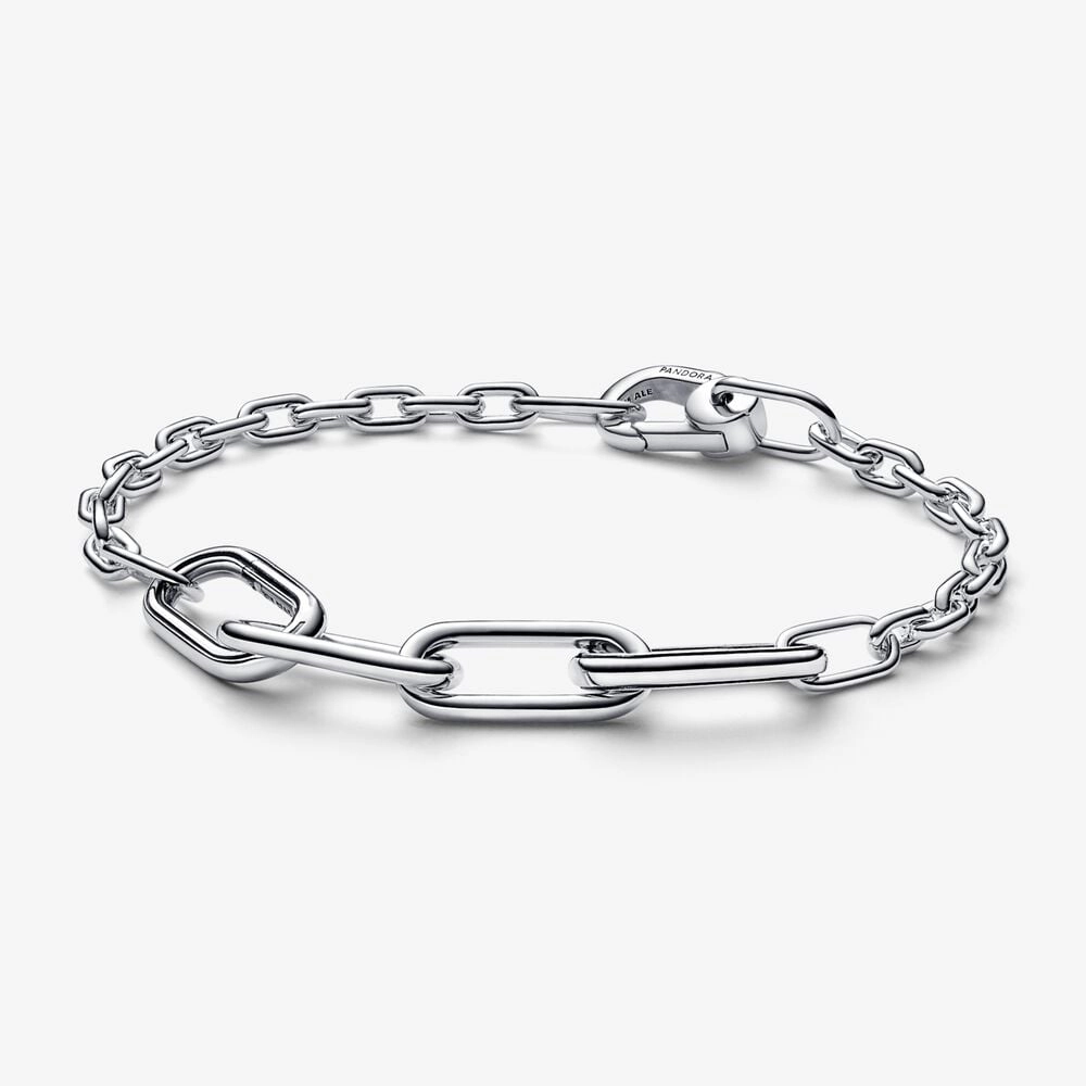 Link what you love like never before. Our sterling silver Pandora ME XS-Link Chain Bracelet holds endless styling possibilities, with more dimensions of links than ever before. The design features two larger openable links separated by a double openable link, a line of slimmer link chains and a carabiner clasp closure. First customise your link chain: four links can be swapped out for one openable double link or one openable link - keep the original length or adjust it to suit you. Once you’ve curated your link chain, style up to two meaningful medallion charms or up to eight mini dangle charms on each openable link to show the world who you are. NOTE: medallion charms with openable tops can be styled on closed styling links.