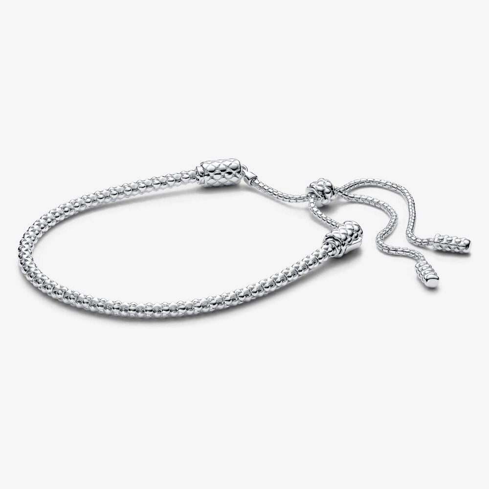 Meet the Pandora Moments Studded Chain Slider Bracelet - our iconic Studded Chain, reimagined. Move the slider to adjust the bracelet for a perfect fit - silicone on the inside keeps it in place. Functional end caps click open to add your charms, and smaller decorative end caps finish the ends of the chain. The reflective studded pattern continues throughout the chain and end caps for a camouflage effect. You can style this sterling silver bracelet with up to 10 charms or dangle charms - stack it with our existing Studded Chain bracelets for a tonal or mixed-metal look.