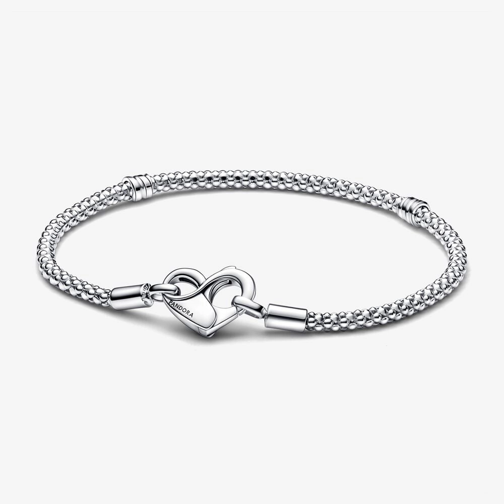 Update your collection with our new Pandora Moments Studded Chain Bracelet. Hand-finished in sterling silver, this bracelet features a flexible, textured chain and an infinity-detailed openable heart-shaped clasp with an interior infinity symbol. Please note: a maximum of 14-18 charms, dangle charms or pendants can be styled among the three sections divided by the threaders.