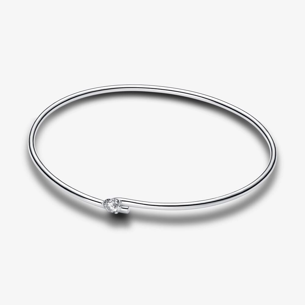 Shine in the Pandora Nova Sterling Silver Lab-grown Diamond Open Bangle. This open bangle is formed from a flexible tube of sterling silver with a 0.25 carat lab-grown diamond at one end, creating an elegant yet dynamic design. The round, excellent cut lab-grown diamond is held within an asymmetric prong setting that gives the illusion of capturing a precious fragment of light. The sterling silver bangle is flexible and should not be bent or squeezed; simply twist and slide it easily onto your wrist. Style it alone or stack together with its 14k gold counterpart for a mixed-metal look. Please note, each Pandora Lab-grown diamond is treated with a post-growth color enhancement called annealing.