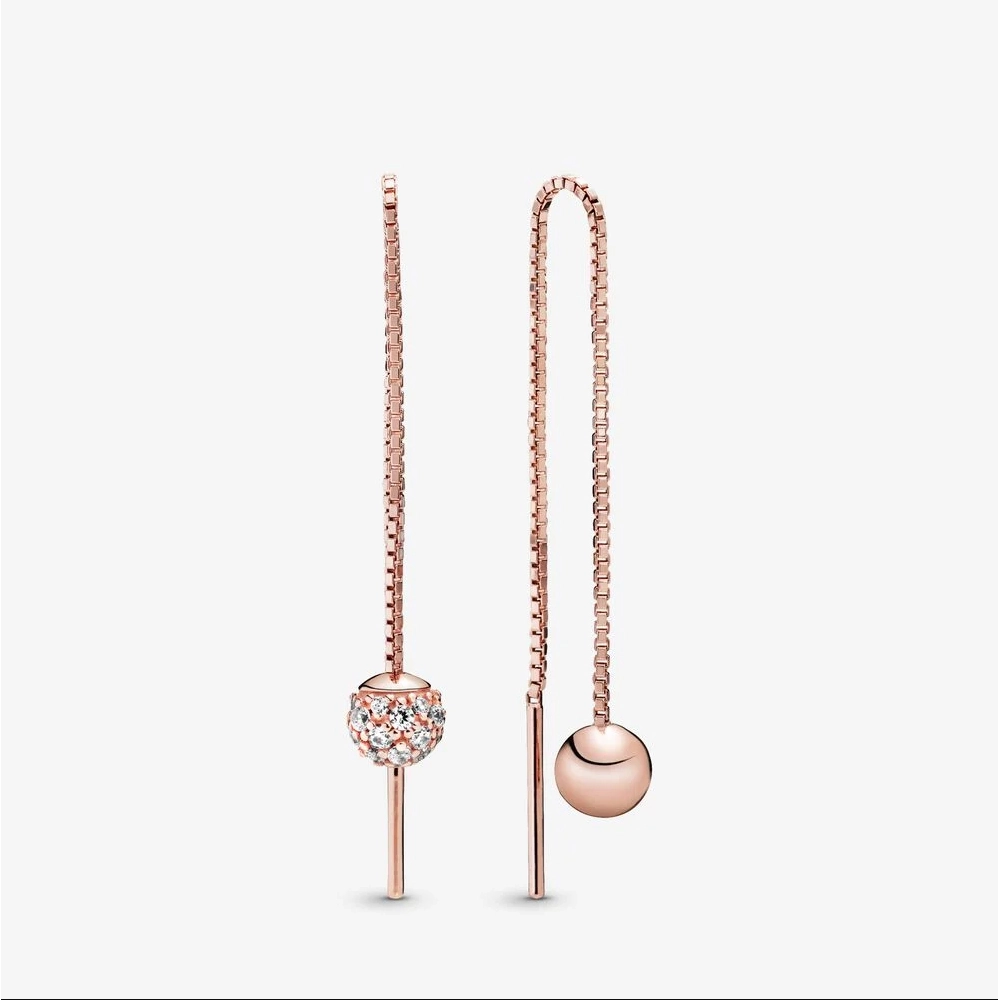 Express the true you by accessorizing with these Pandora Rose™ (14k rose gold-plated unique metal blend) polished and pavé bead dangles featuring long chains and mismatched beads. One bead features a polished bead and the other features 25 pavé-set cubic zirconia, making it an elegant yet unexpectedly different combination. These eye-catching earrings are sure to light up any outfit and add a sense of fun with their quirky mismatched details.