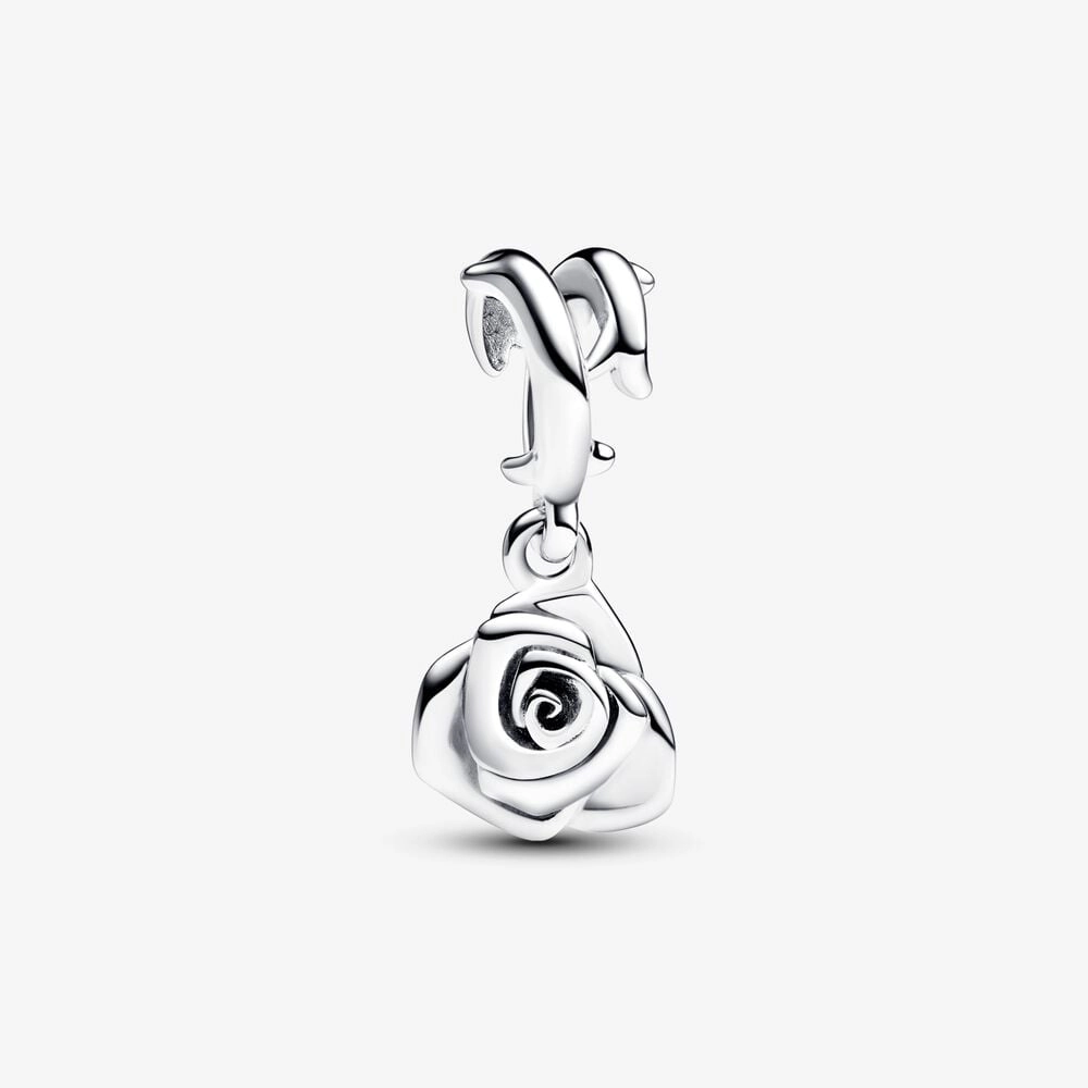 Embrace the symbolism of flowers with the Rose in Bloom Dangle Charm from Pandora Moments. Crafted in sterling silver, this charm showcases a delicate, three-dimensional rose with layered petals that evoke the essence of blooming love. The polished convex back adds a touch of sophistication, while the sterling silver bail, fashioned as the rose's stem with raised thorns, adds a touch of realism. A symbol of timeless love, this charm captures the classic gesture of gifting a rose with a unique Pandora twist.
