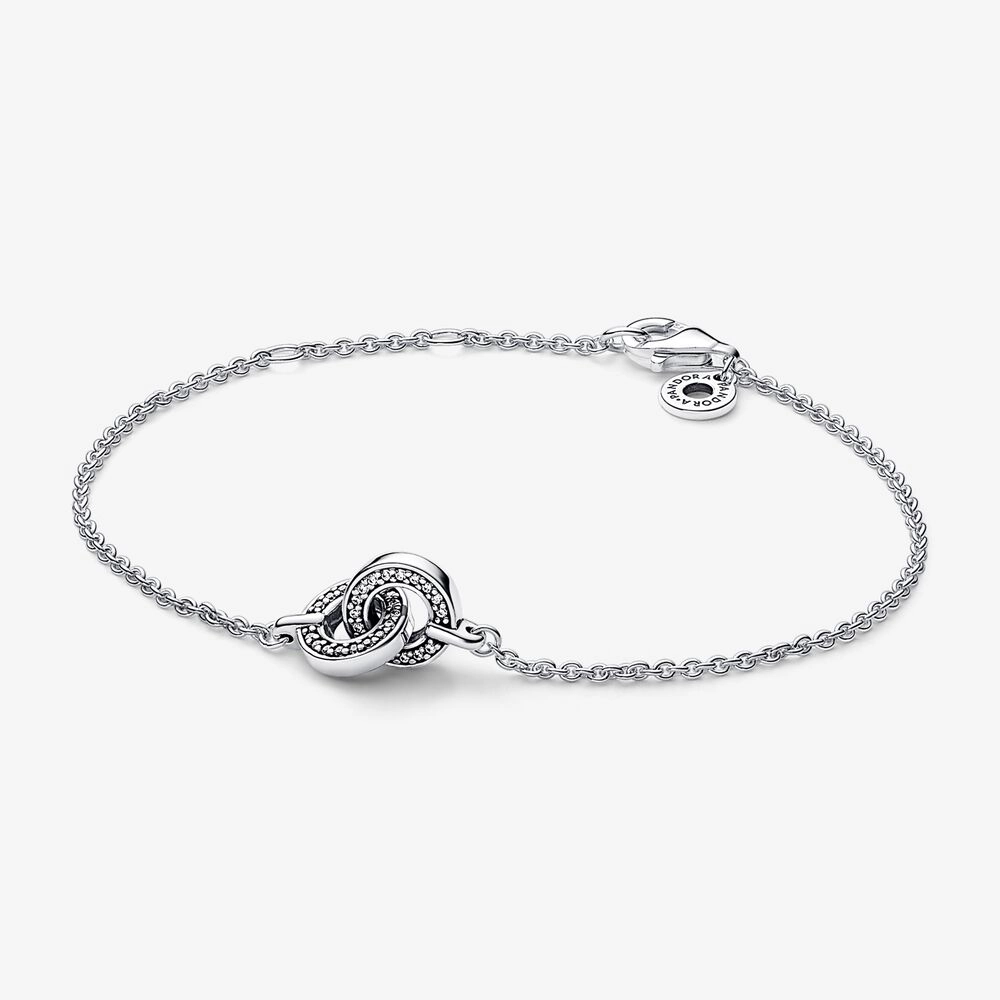 Build your look around the Pandora Signature Intertwined Pavé Chain Bracelet. Crafted in sterling silver, this chain bracelet features a pair of intertwined moveable circles accentuated with a row of sparkle and microbeads in their centres. While they are the same size, one features a polished back and the other an engraved back with two Pandora logos. An essential style in every collection, this easy-to-wear piece is set to become your most-worn style to date.