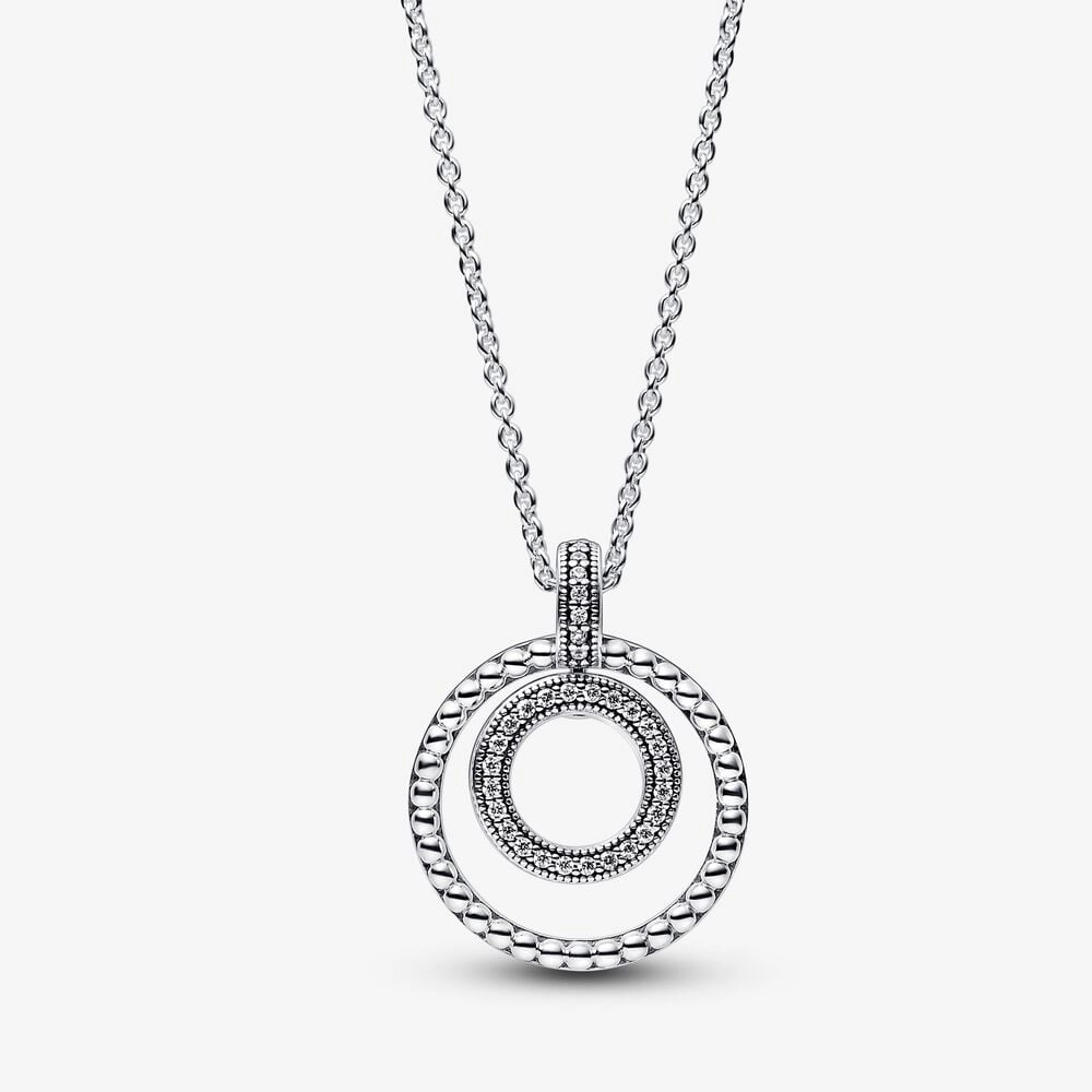 Our classic Pandora Signature design elements have come full circle. Crafted from sterling silver, the Pandora Signature Pavé & Beads Pendant & Necklace features two textured circles, one of which spins for a touch of dynamic movement. Cut-out hearts adorn the pendant’s reverse while a row of pavé sparkles on the bail. Two jump rings allow you to adjust the length, making it your perfect go-to piece for any occasion.