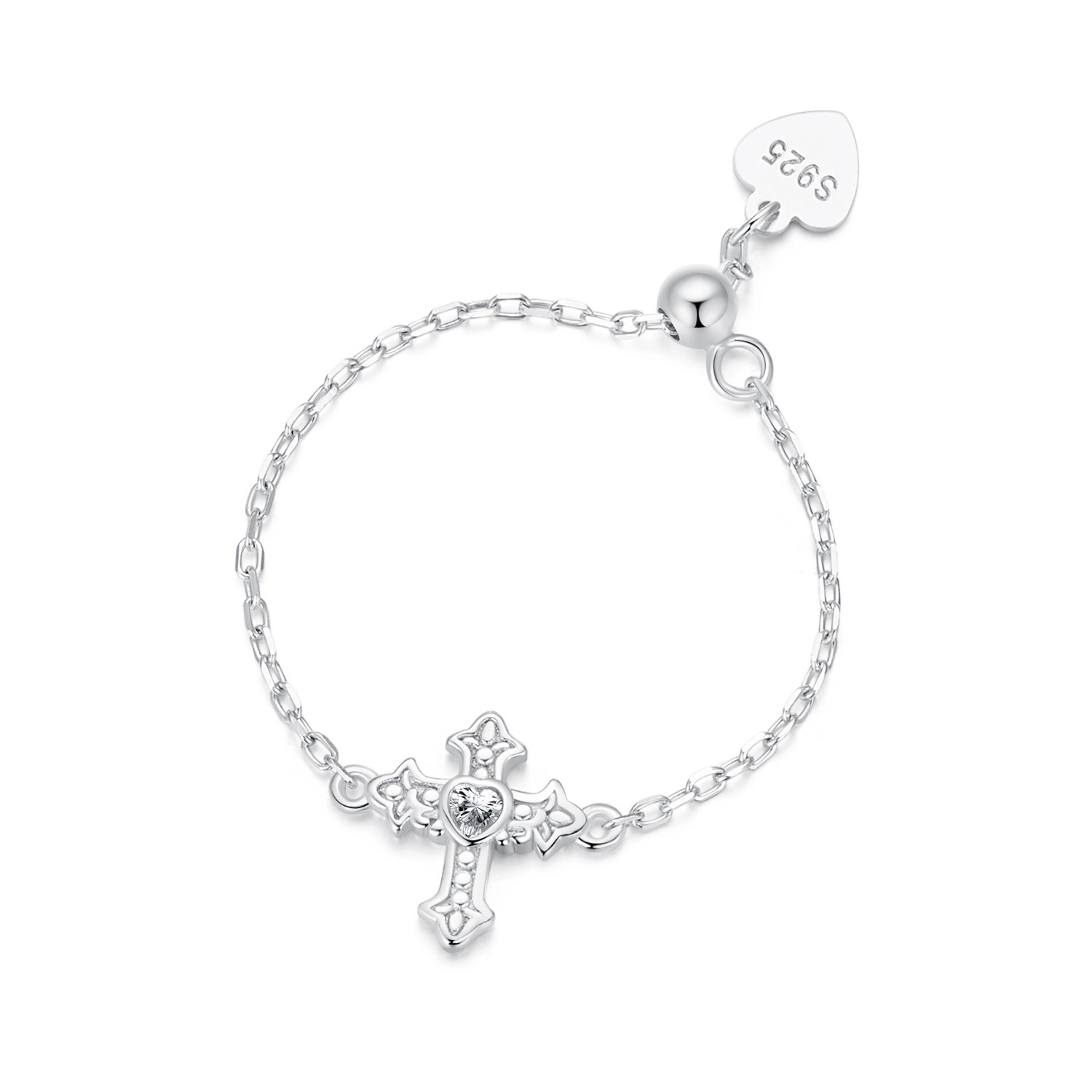 The cross chain ring is inlaid with a heart-shaped zircon in the middle, with a sweet and cool punk style and a simple personality.
