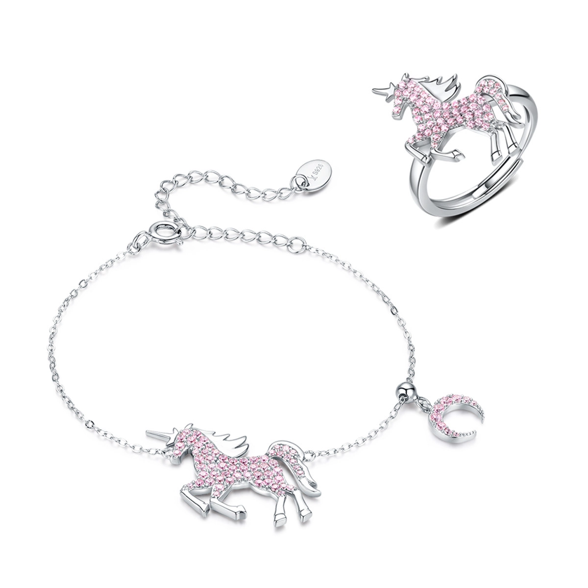 The Pandora Style Cute Unicorn Jewelry set - SET009, a magical collection that will add an enchanting touch to any outfit. This adorable set includes a necklace, bracelet, and earrings, all featuring the whimsical and mystical unicorn design.Crafted with attention to detail, each piece in this set is made with high-quality materials, ensuring durability and long-lasting beauty. The unicorn pendant on the necklace hangs delicately on a silver chain, while the bracelet features a charming unicorn charm, adding a playful element to your wrist. The earrings are designed with precision, showcasing the unicorn's majestic presence.Not only does this jewelry set exude charm, but it also offers versatility. Perfect for all occasions, you can effortlessly dress up or down with this set. Whether you're attending a casual gathering or a formal event, the Pandora Style Cute Unicorn Jewelry set - SET009 will make you stand out with its whimsical elegance.Aside from its aesthetic appeal, this jewelry set also makes for a thoughtful gift. The unicorn symbolizes purity and magic, making it a meaningful present for loved ones. Whether you're surprising a friend, family member, or special someone, this set is sure to bring joy and smiles.Indulge in a touch of fantasy with the Pandora Style Cute Unicorn Jewelry set - SET009. Let its charm and elegance transport you to a world of magic and wonder.
