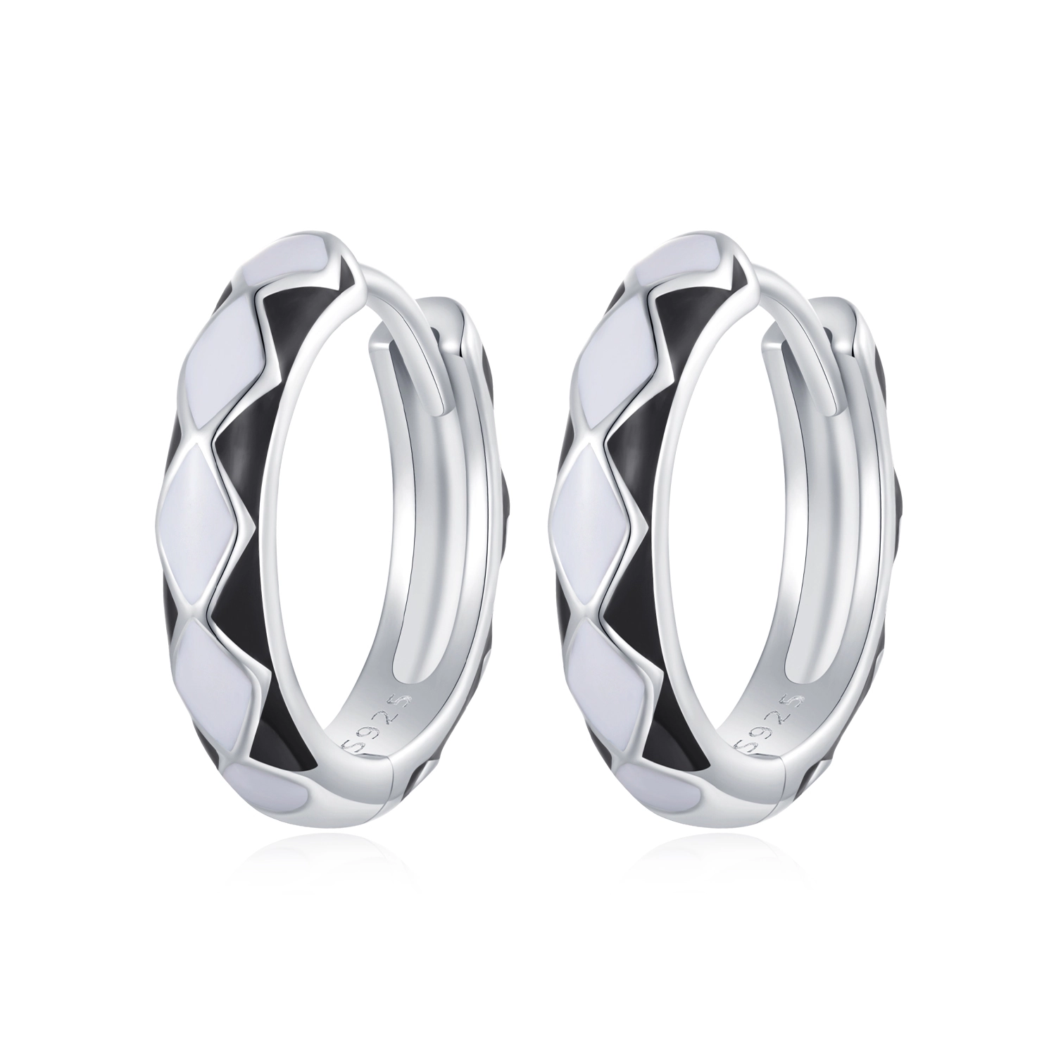 Our stunning Pandora Style Diamond-shaped pattern Hoop Earrings - SCE1611-BK! These earrings are the perfect blend of classic elegance and contemporary fashion. The black and white grid design creates a striking and timeless pattern that is sure to turn heads.