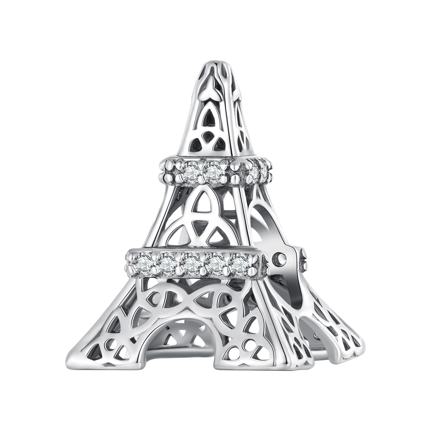 The Pandora Style Eiffel Tower Charm - SCC2465, a breathtakingly beautiful charm that exudes elegance and sparkle. This charm features a meticulously crafted Eiffel Tower design, adorned with dazzling cubic zirconia stones that make it shine in all its glory.