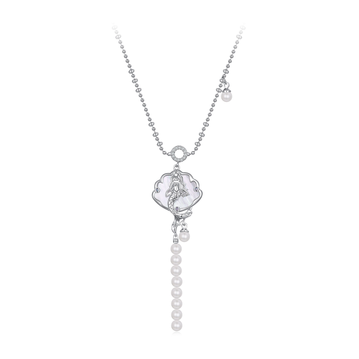 The shy mermaid sits on the shell, looking into the distance, as if waiting for the one she loves to appear. The design of the mother-of-pearl, the shell shape, and the pearls are a precious gift from the ocean.