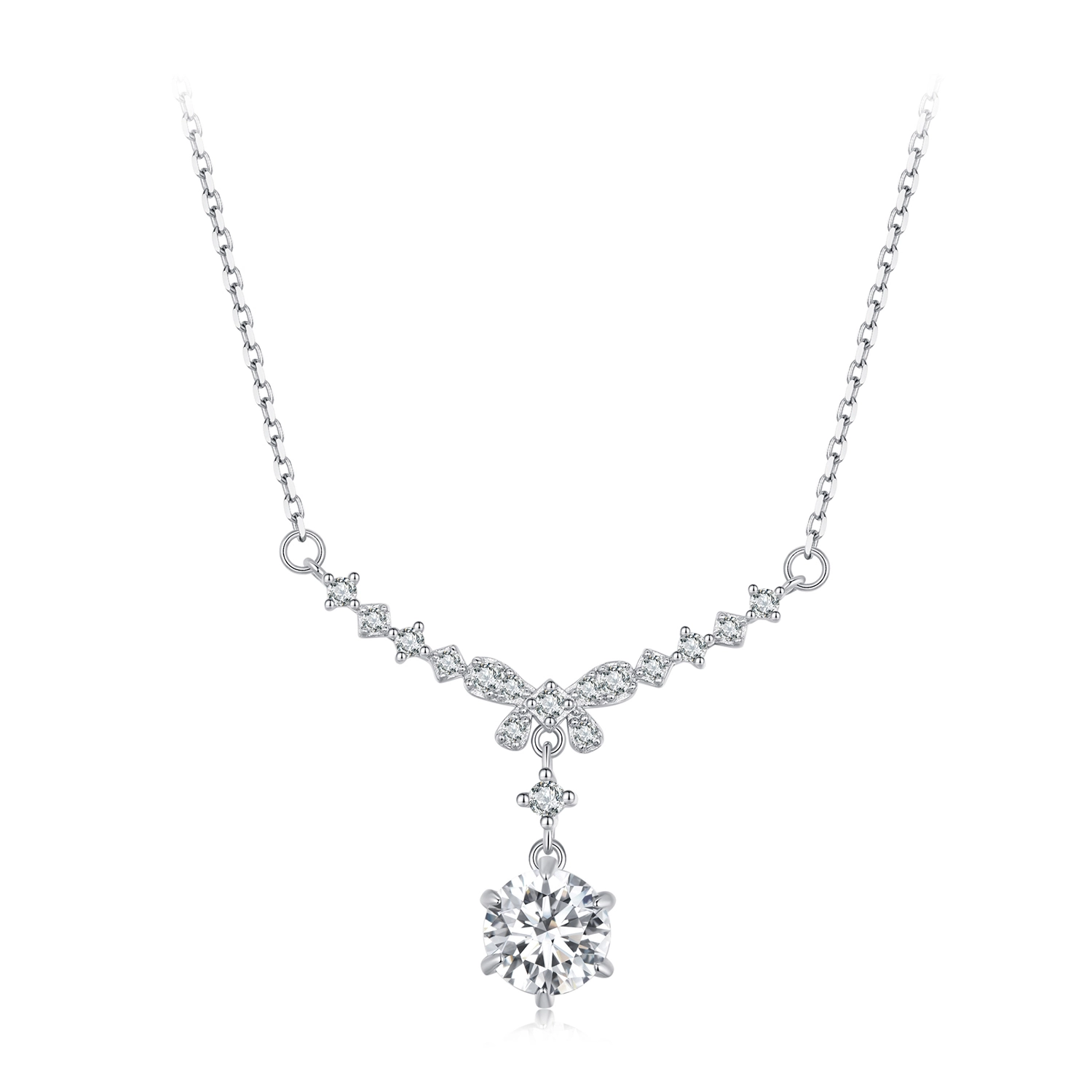 Crafted with meticulous attention to detail, the pendant features a captivating butterfly bow design, symbolizing freedom and transformation. The lustrous Moissanite gemstone adds a touch of brilliance, sparkling with every movement. Known for its exceptional fire and brilliance, Moissanite is a gemstone that rivals even the finest diamonds, ensuring that this necklace will catch the eye and turn heads wherever you go.
