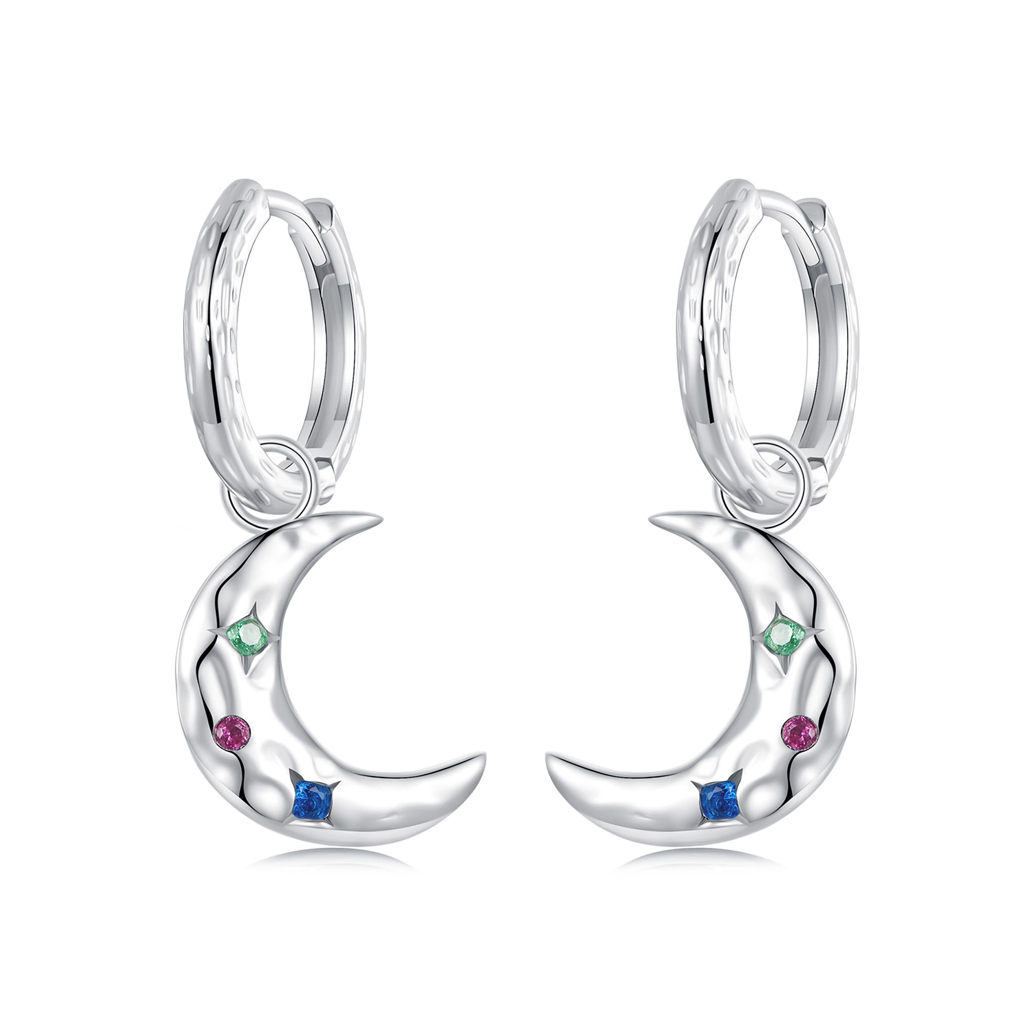Moon earrings, with a textured moon inlaid with colored stones and stars dotted on the moon, symbolizing a romantic and beautiful night with the stars and the moon accompanying each other.