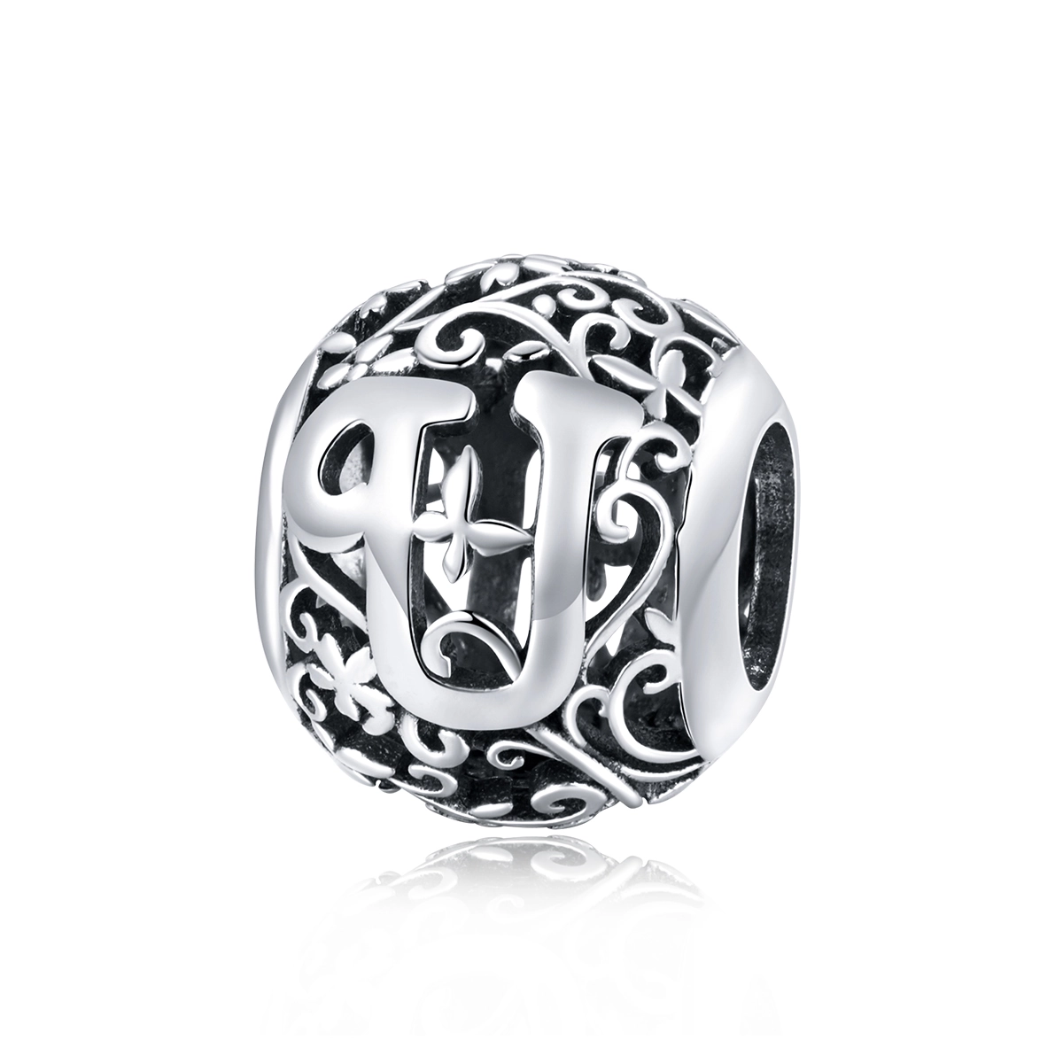 The Pandora Style Openwork Flower Letter U Charm - SCC1444-U, a delightful addition to your charm bracelet that radiates elegance and personalization. Crafted with meticulous attention to detail, this charm showcases a beautiful openwork flower design, exuding a touch of delicate femininity.