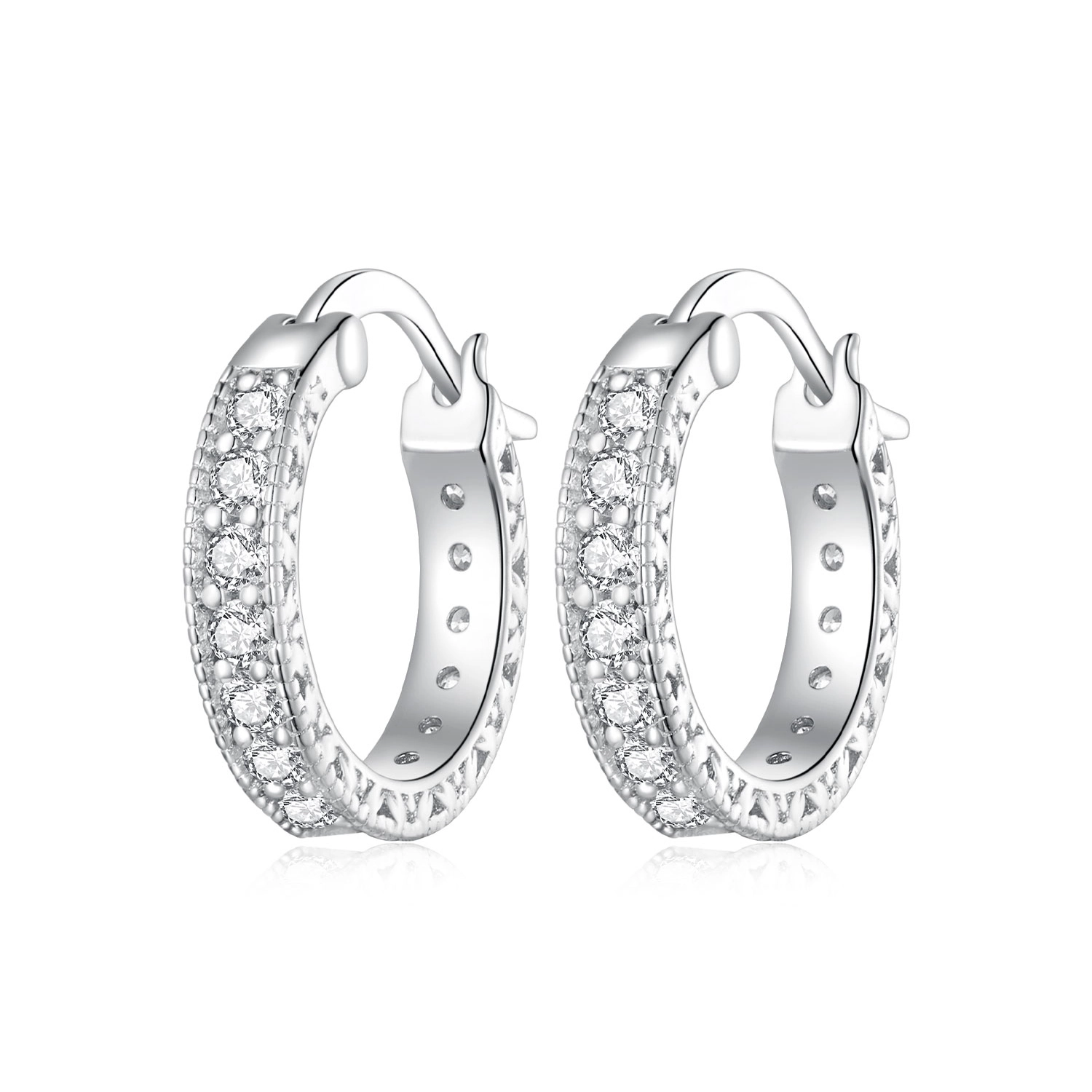 Our exquisite Pandora Style Shine Hoop Earrings - BSE868, the perfect choice for your everyday wear. These earrings are adorned with sparkling white zircon stones intricately set on the hoop, accentuated by delicate textured details on the sides.