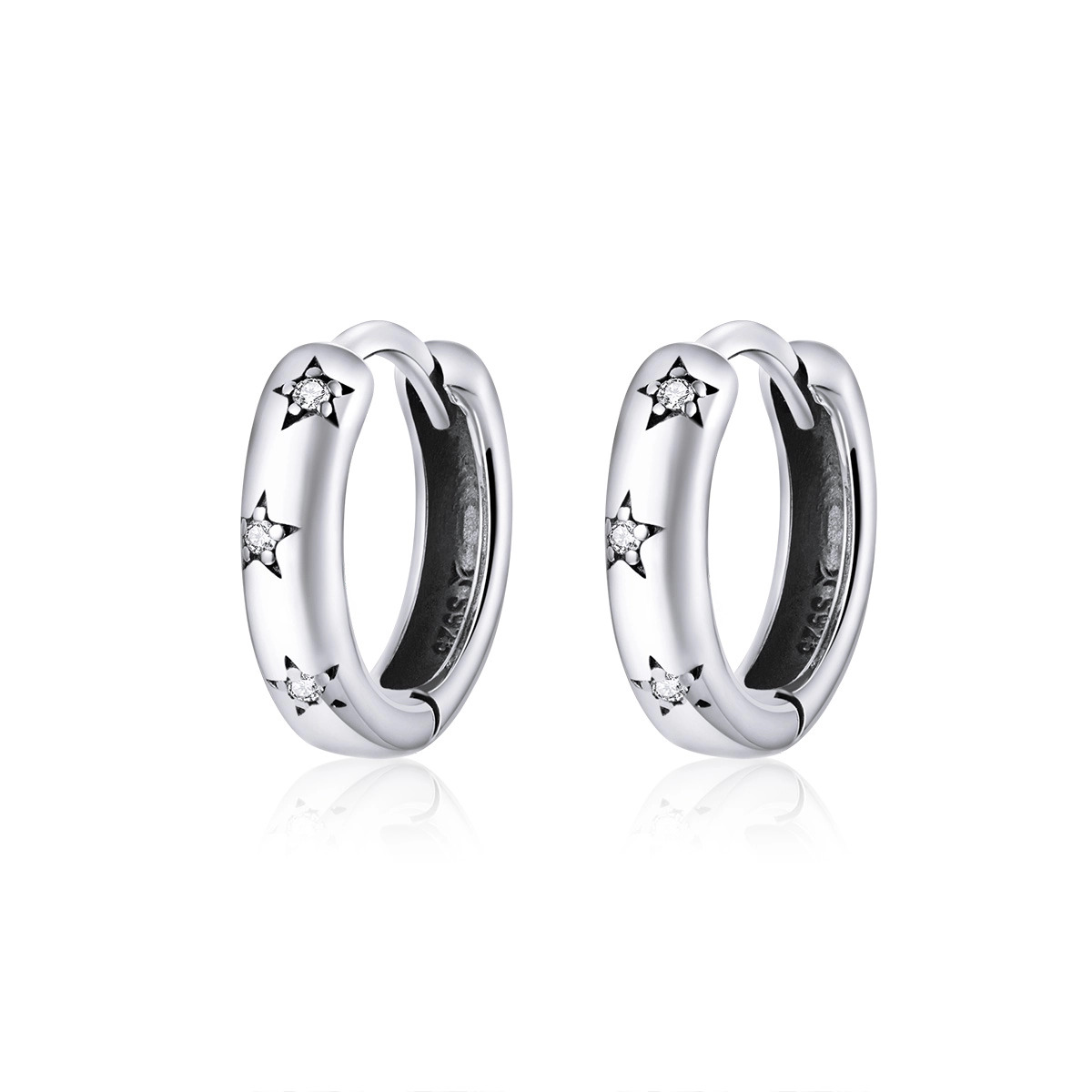 Featuring a hoop design, these earrings showcase a delicate arrangement of shimmering stars. The intricate detailing adds a touch of elegance and sophistication to any outfit, making them a versatile choice for both casual and formal occasions.