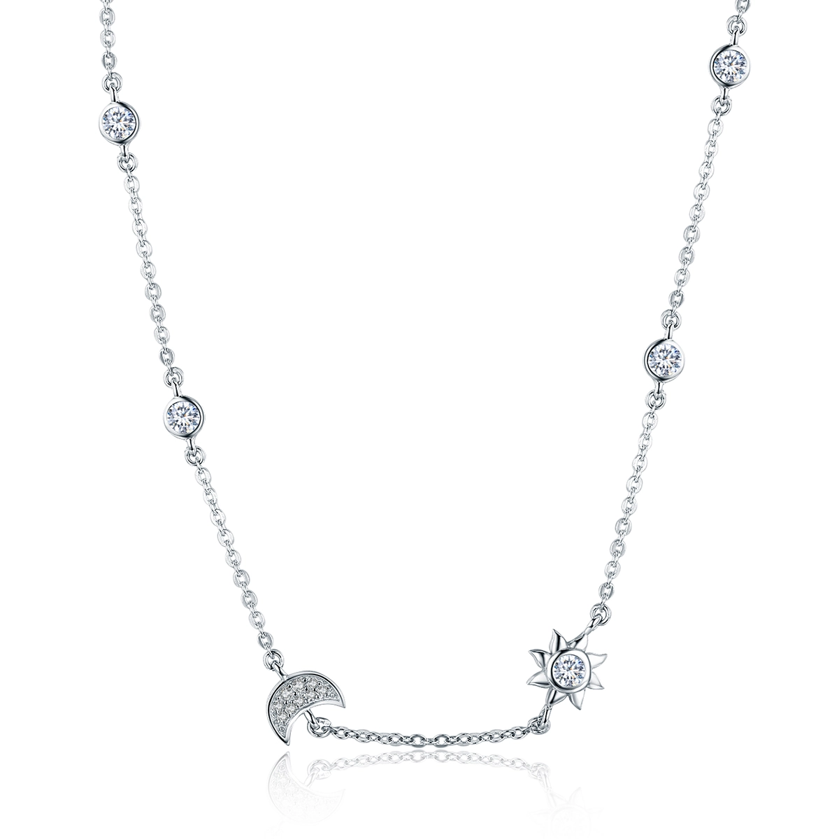 The captivating Pandora Style Silver Sun and Moon Glory Chain Necklace - SCN272, a celestial-inspired piece that will elevate your style to new heights. Crafted with meticulous attention to detail, this necklace is a true symbol of grace and elegance.