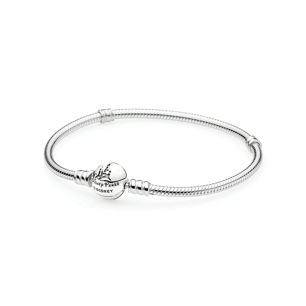The perfect starting point for your Disney-themed collection, PANDORA's classic and patented silver bracelet is embellished with a Fantasyland Castle and Disney Parks engraving.