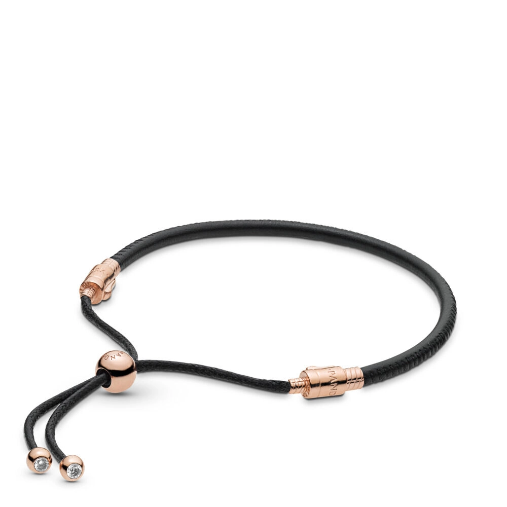 Our versatile Pandora Rose sliding bracelet is crafted from black leather and our unique metal blend plated with 14ct rose gold. The flexible Pandora Rose design has a sliding clasp for the perfect fit, detailed at the end caps with glittering stones. The blush-pink piece can hold up to six charms – although it looks equally beautiful on its own. Wear the bold piece with favourite charms, old and new, or with a bracelet stack of contrasting textures.